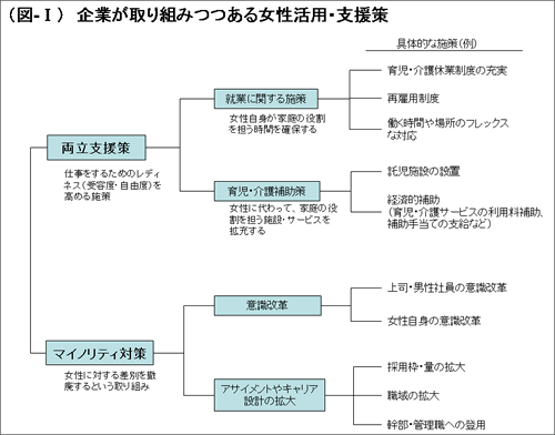 このような状況下で、多くの企業が積極的に女性を活用するための施策に取り組んでいる。これらは、女性が仕事に従事するためのレディネス(受容度、自由度)を高めるための「両立支援策」と、企業文化に染みついた男女差別を撤廃するための「マイノリティ対策」の二つに整理することができる。