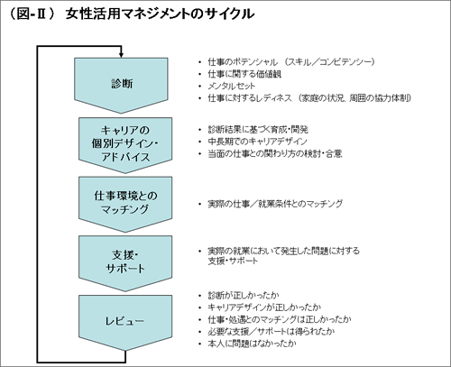 特に長期にわたる関係を維持し、継続的にサポートすべき女性に対しては、一つのモデルとして、図2のような女性活用マネジメントのサイクルを回していくことを提案したい。このサイクルを回すことによって、無理のない就業を可能とし、同時に成長を促進することもできるのではないかと考える。